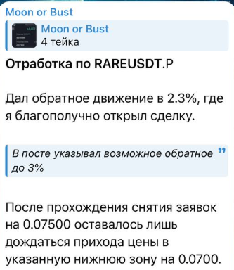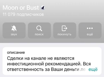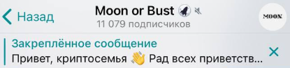 Moon or Bust – проект, который ведет трейдер в телеграмм-канале и предлагает подписчикам зарабатывать с помощью его методов и финансовой аналитики какую крипту лучше покупать, а какую продавать в данный момент.