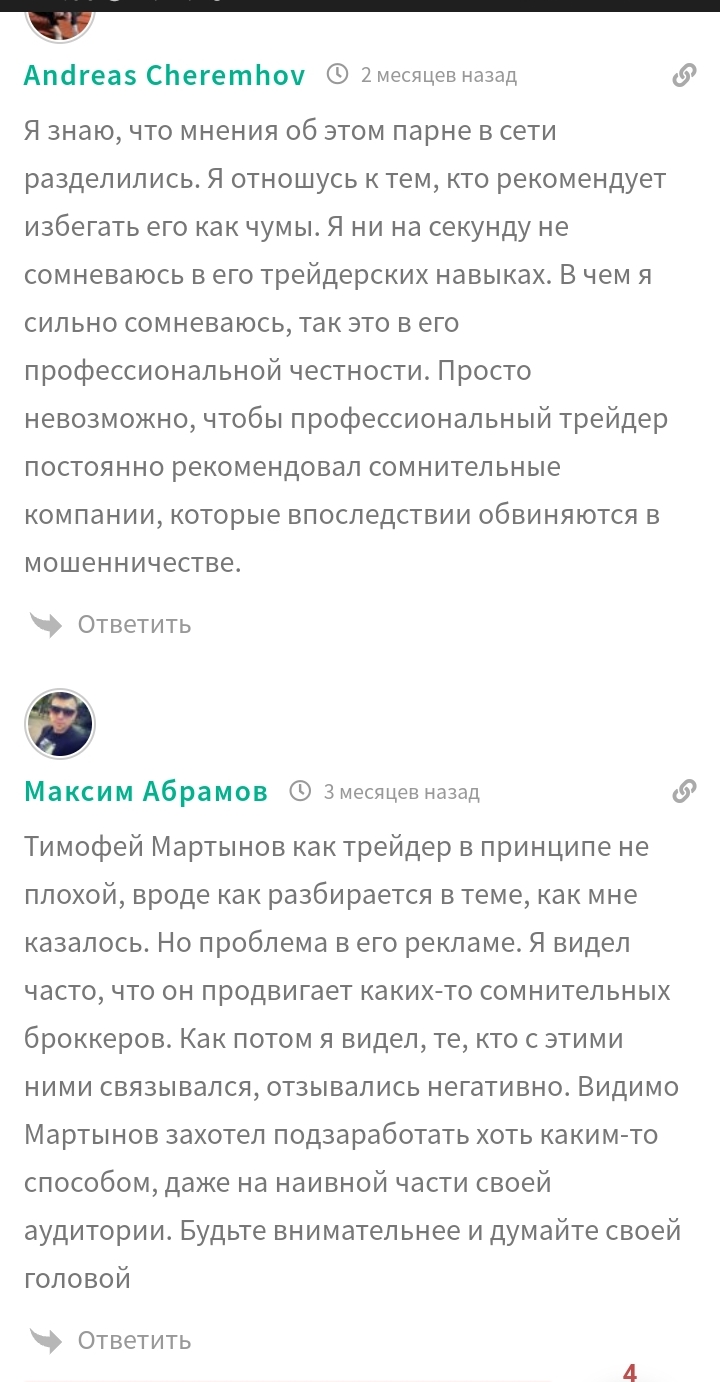 О самом Тимофее Мартынове отзывы также неоднозначны. В профессионализме трейдера практически никто не сомневается. Однако, многие уверены, что основная цель его аналитики и прогнозов – привлечь инвесторов на проплаченные площадки. Комментаторы приводят реальные примеры, когда распиаренные Мартыновым проекты оказывались скамом.