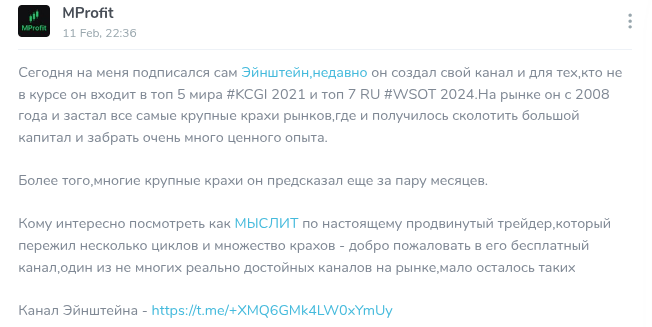- В ленте регулярно мелькают репосты других каналов, например, некоего «Эйнштейна», которого @ Mprofitmatvey называет «топ-5 мира». Подобный взаимный пиар (cross-promo) характерен для сеток мошеннических каналов, когда они переливают трафик друг на друга, чтобы постоянно находить наивных «хомяков» (новичков в крипте).