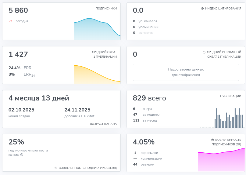 При первичном анализе MProfit сразу же можно заметить явный дисбаланс метрик. Каналу всего четыре месяца (создан в октябре 2025 года), но на него уже подписано более 5000 человек. Для авторского блога без мощной медийной поддержки и внешнего маркетинга такой рост выглядит очень неестественно.