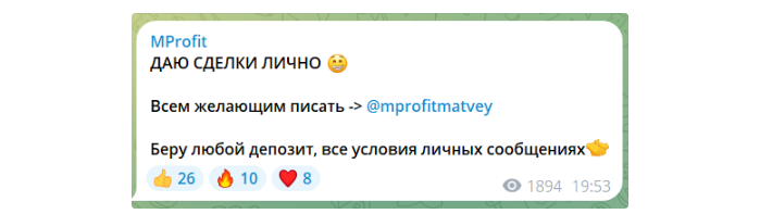 MProfit — очередной телеграмм-канал, где анонимный «гуру» под ником @ Mprofitmatvey пытается изображать из себя успешного спекулянта и филантропа.