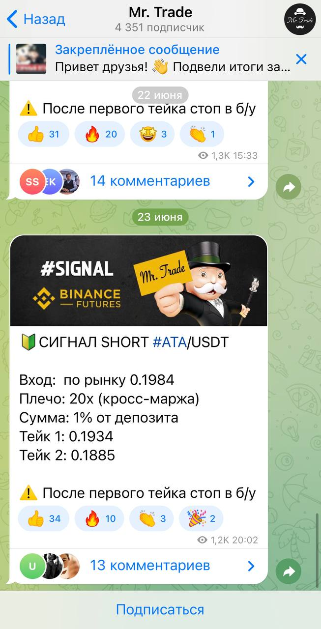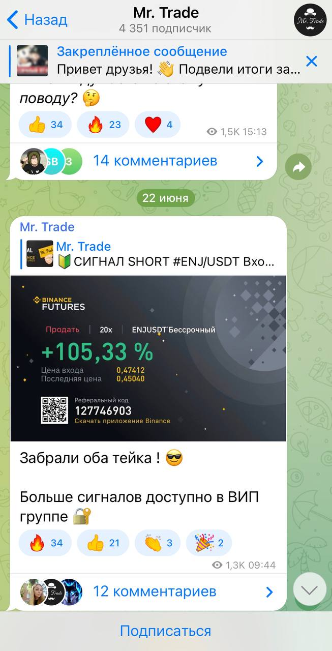 Число подписчиков телеграмм-канала успело достигнуть 4 500 до момента удаления профиля. В среднем, за день на Mr. Trade появлялось по 4 поста, но отзывы отсутствуют, несмотря на активность подписчиков. В бесплатном доступе публиковались сигналы для сделок в прибыль, но автор не учил покупать и продавать активы, а давал готовые инструкции – точки входа, распределение банкролла и т.д.