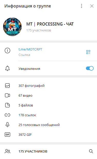 MT Processing функционирует в формате группового чата. В нем состоит всего 175 человек, из которых активно менее 10%, то есть это небольшое сообщество. Отсутствие закрепленного описания, ссылки на внешние ресурсы, контактных данных администрации и юридической информации затрудняет идентификацию владельцев.