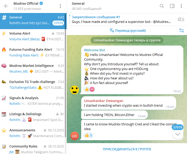 У компании есть телеграмм-канал с названием Mudrex Official и ником @OfficialMudrex. На декабрь 2025 года на него подписано 12 852 человека. Это сообщество состоит из разделов поддержки, основных правил торговли на криптобирже, чата для общения клиентов организации. Общение ведется на английском или индийском языках.