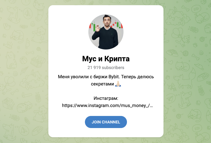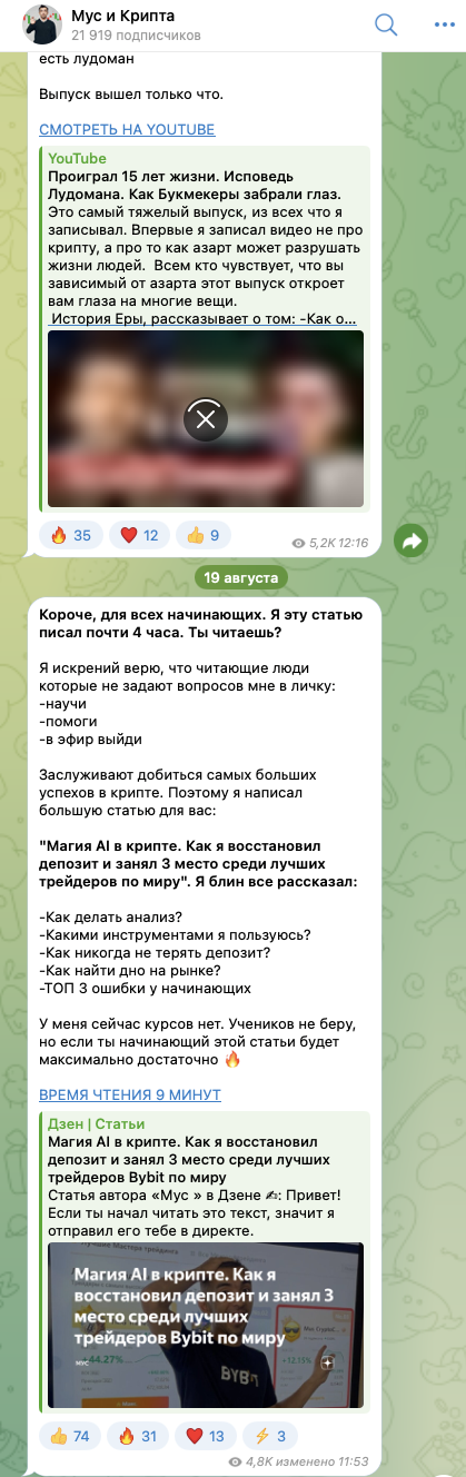На телеграмм-канал «Мус и Крипта», на 21 августа 2024-го года, подписано почти 22 тысячи пользователей. Публикации, в среднем, просматриваются около 5 тысяч раз.