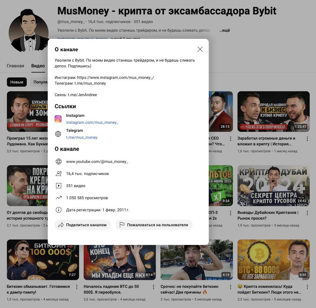 На ютуб-канале «MusMoney крипта от эксамбассадора Bybit», Mus Money подписано около 16,4 тысяч человек. За все время автор выложил 350 видео, которые в сумме собрали чуть больше 1 миллиона просмотров.
