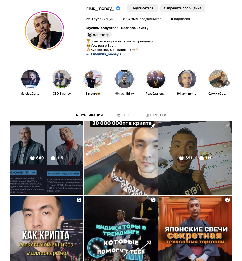 Страница «Мус Моней» есть и в Instagram. Муслим Абдулаев позиционирует ее как блог о крипте. На этот аккаунт подписано более 88,4 тысяч пользователей. При этом, за все время существования аккаунта его админ сделал свыше 550 публикаций.