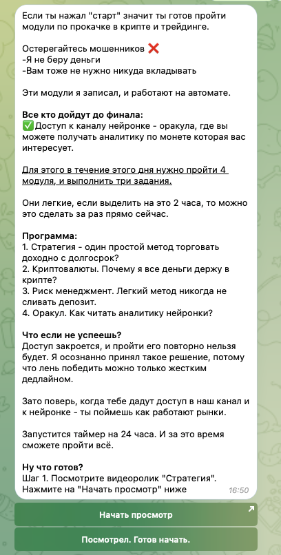 При этом, из приветственного сообщения сразу же становится понятно, что данная система тоже предназначена для прогрева. По завершению курса пользователю нужно будет выполнить несколько заданий, за счет чего автор проекта и заработает.