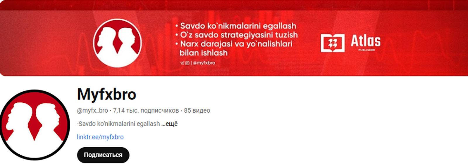 На канале Myfx bro на Ютубе 7 000 подписчиков, ролики собирают от 1000 до 5000 просмотров. Посвящены видео разбору токенов, трейдингу и инвестициям в крипту. Ролики также на узбекском языке.