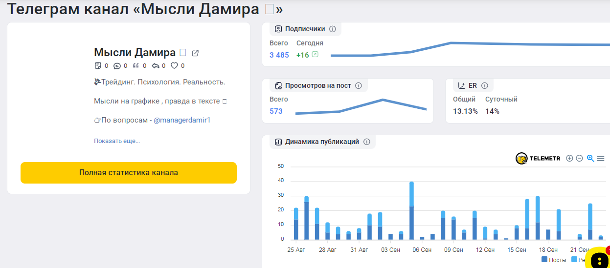Канал демонстрирует стабильную активность. Ежедневный прирост аудитории составляет в среднем 16 человек. Показатель вовлеченности находится на уровне 13-14%. Это свидетельствует о живом интересе аудитории.