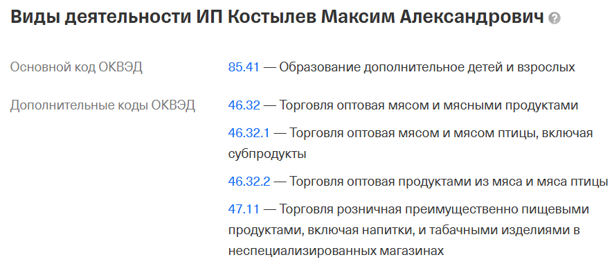 Независимые сервисы проверки ИП показывают, что Костылев зарегистрировал направление деятельности — дополнительное образование, но дополнил его оптовой торговлей мясом и табачными изделиями. Совмещение столь разных видов деятельности делает данную «контору» крайне подозрительной.