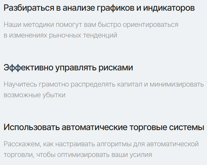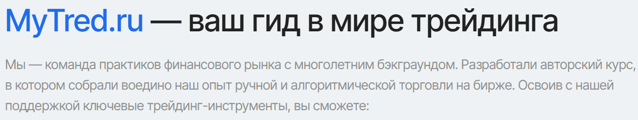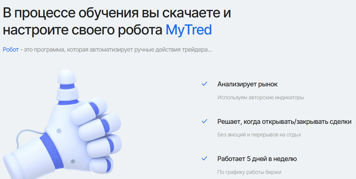 Главный продукт, который предлагают на сайте Mytred ru — это обучение трейдингу. Разработчики специального «курса» обещают помочь всем желающим разобраться в анализе графиков и управлении рисками, а также в использовании «роботов» для торговли.