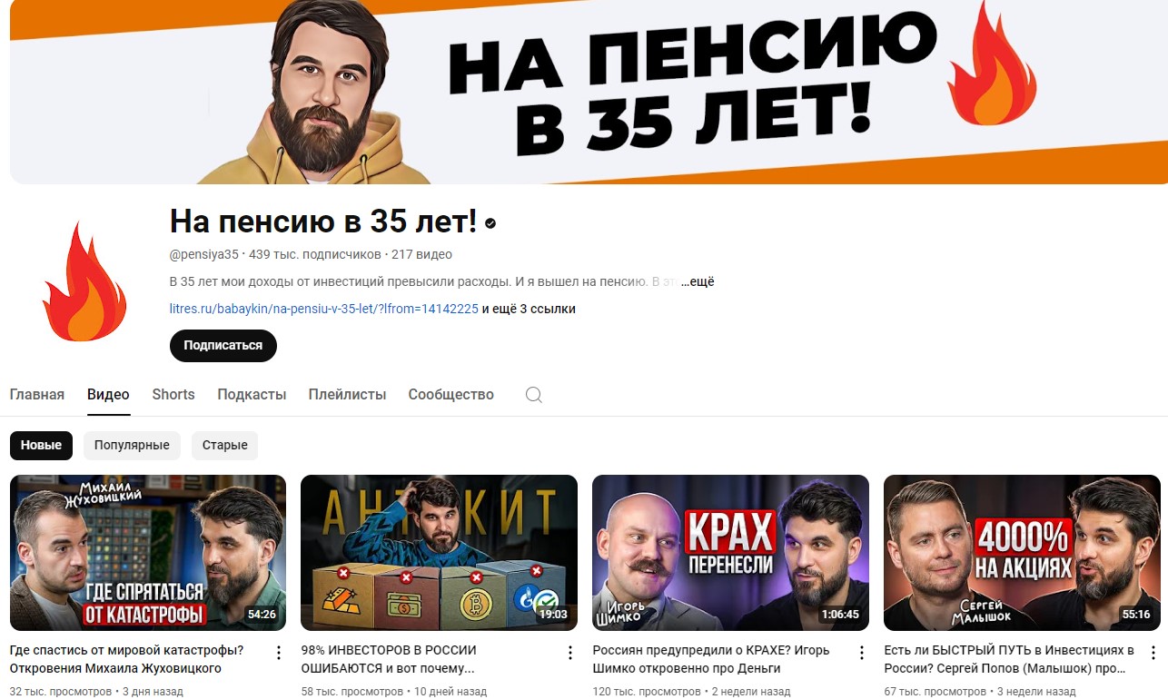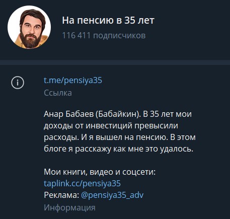 Сообщества На пенсию в 35 лет начали появляться в 2021 году, за их созданием стоит бывший IT-предприниматель Анар Бабаев или Бабайкин. Некоторое время он скрывал лицо, в кадре на Ютубе появлялся только в маске, позже назвал свое имя и перестал скрываться.