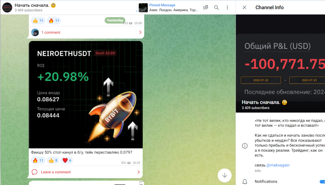 Начать Сначала Телеграмм канал, направленный на торговые сигналы и мысли по трейдингу. В блоге также предоставляются обучающие публикации по торговле криптовалютами. Из платных услуг автор предлагает воспользоваться копитрейдингом. Мы провели анализ ресурса и готовы сообщить, работает ли трейдер честно.