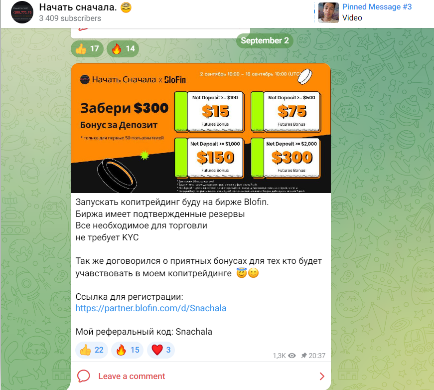 Основатель Телеграмм канала Начать Сначала не предоставляет доказательств профессионализма в трейдинге. В своем блоге автор регулярно рекламирует сторонние проекты. Кроме того, он призывает пользователей проходить регистрацию на бирже по своей реферальной ссылке. Основные минусы: