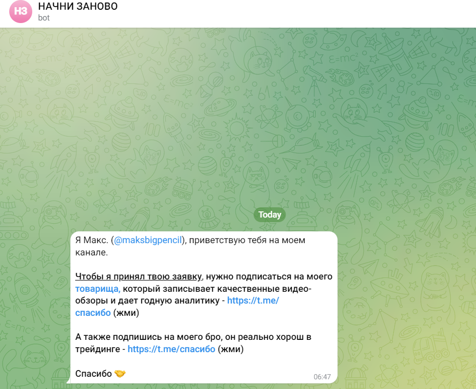 Стоит начать с того, что паблик закрытый. Когда пользователь запрашивает доступ, запускается бот. Он информирует о том, что заявка на вступление в группу будет принята после того, как человек оформит подписки на сторонние каналы.