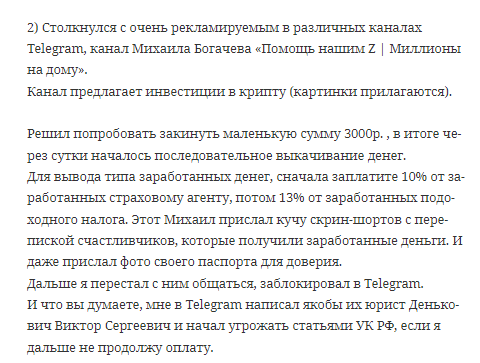 Например, пользователь с ником Бохадир пишет, что перевел 5500 рублей, но обещанные 50000 рублей ему так и не выплатили. Он прямо называет проект мошенническим. После блокировки мошенника с ними связывается человек, представляющийся юристом advokat denkevich. Он начинает угрожать уголовными статьями УК РФ, требуя продолжения платежей.