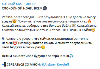 Еще один пост содержал признание – после результатов автор долго не мог уснуть. Писал, что каждый день подписчики зарабатывают больше. Читал положительные отзывы. Называл это кайфом. Призывал участвовать в будущем розыгрыше.