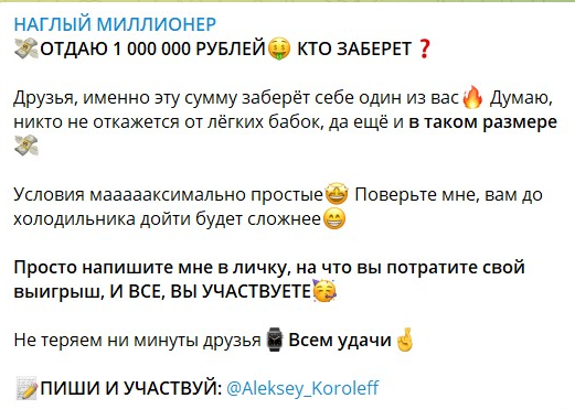 Главное предложение – розыгрыш 1 000 000 рублей. Алексей Королев утверждал, что разыграет эту сумму среди участников. Условия были простыми. Нужно было написать автору в личку и ждать результатов. Автор писал, что ему не жалко денег. Утверждал, что не теряет времени подписчиков. Призывал всех участвовать.