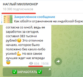 Канал «Наглый миллионер» в пике набрал около 10 400 подписчиков. Но эта цифра – результат накрутки. Реальные просмотры постов составляли всего 700 человек. Разница огромная. Это явный признак искусственного раздувания аудитории.