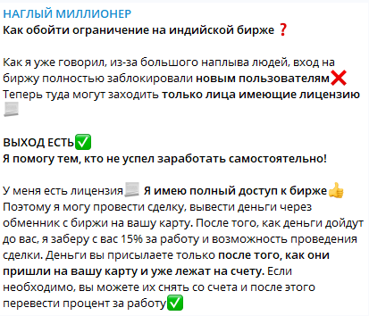 Второе направление – помощь в заработке на индийских биржах. Aleksey Koroleff предлагал обойти ограничения на торговых площадках. Из-за притока людей биржи якобы блокировали доступ новичкам. Но автор обещал решение через свои связи.Условия такие: автор выводит деньги через обменники, забирает 15% за работу, остаток переводит клиенту. Деньги должны были приходить после того, как средства уже на счету. При необходимости можно было снять деньги и вернуть часть автору.