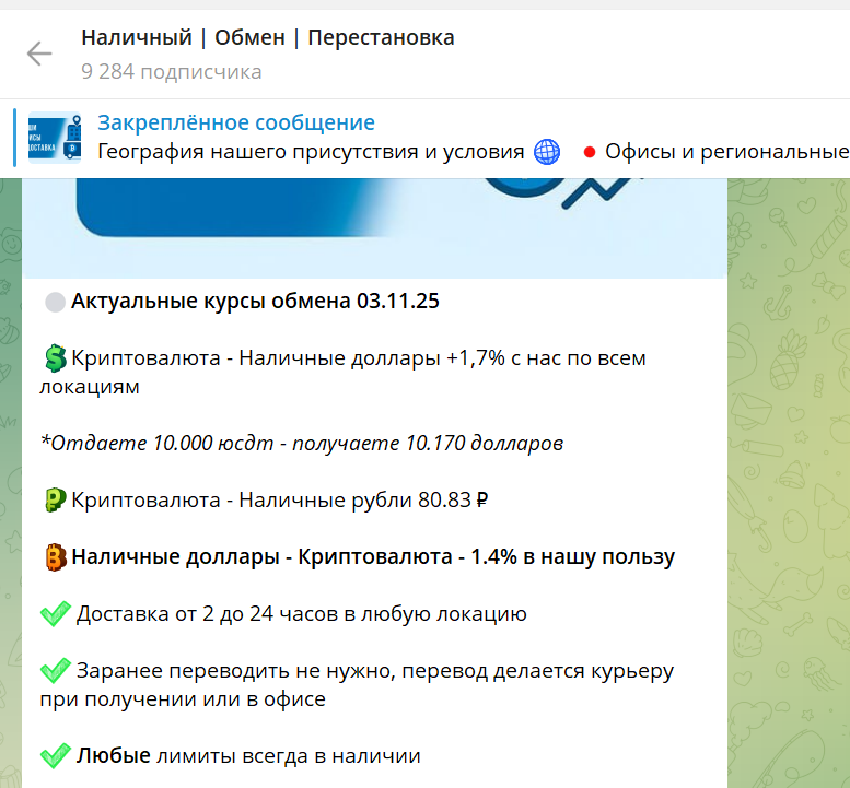 Всю информацию о проекте можно узнать только на канале в Telegram, который запустили в августе 2024 года. Здесь около 9000 подписчиков, но лишь 19% из них просматривают посты, а вовлеченность не доходит даже до 0.5%, хотя это может быть связано с тем, что администратор отключил комментарии и возможность копирования контента.Такая статистика и блокировки могут указывать на накрутку и желание сохранить максимальную анонимность, тем более, в других социальных сетях проект «Наличный | Обмен | Перестановка» никак не представлен. Официального ресурса тоже нет, поэтому анализировать больше нечего, но непонятно, почему владельцы сосредоточили свою деятельность именно в Телеграмм.