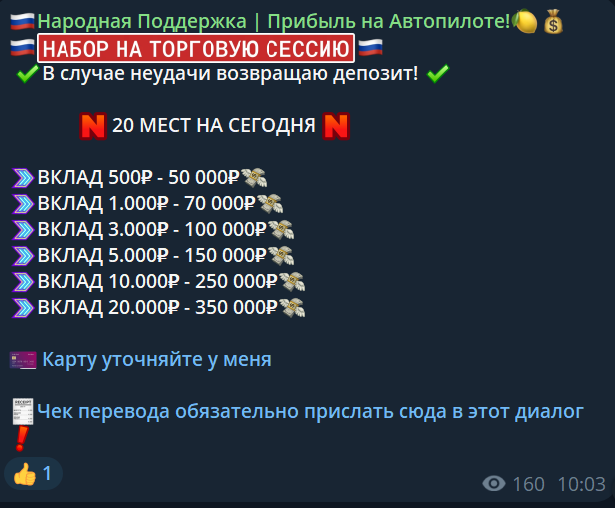 Тг-канал «Народная Поддержка Прибыль на Автопилоте» управляется неким опытным инвестором по имени Ульяна. Деятельница предлагает вложить небольшую сумму и получить в разы больше при помощи арбитража криптовалют. Однако анализ демонстрирует, что это схема мошенничества для выманивания денег. В этой статье мы разберем функционал финансового проекта и выясним, стоит ли ему доверять.