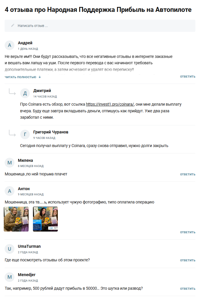 На независимых платформах представлены негативные впечатления о канале «Народная Поддержка Прибыль на Автопилоте». Один комментаторов отмечает, что канал выглядит привлекательно, но после перевода денег следует игнор со стороны администратора. В итоге проект оказывается скамом, где средства исчезают без возврата.