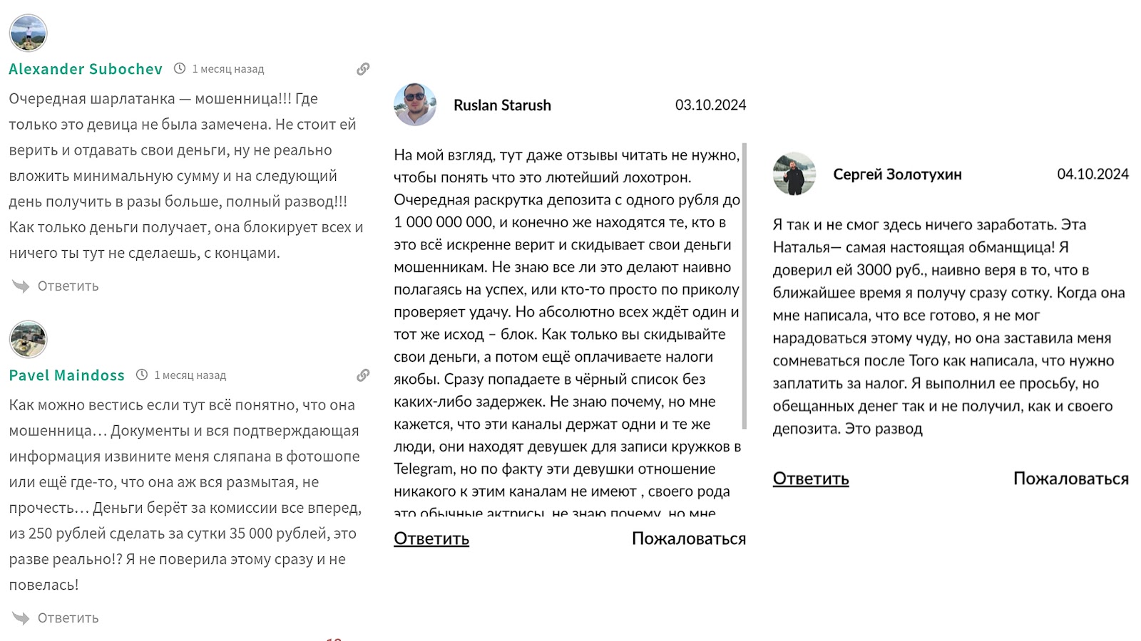Под руководством данного автора было создано множество идентичных скам-проектов, где крадут средства людей под предлогом раскрутки депозитов. Во всех ресурсах Наталья не демонстрирует документов или других доказательств профессионализма. На Телеграмм канал часто поступают жалобы от клиентов. Минусы:
