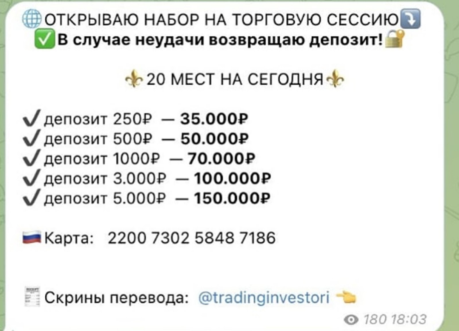 Регулярно автор проекта Наталья Криптовалюта проводит набор на сессию по торговле. То есть предлагает услугу по доверительному управлению. Пользователям обещают следующее:- вложить 250 рублей. С них можно получить 35 тысяч рублей;