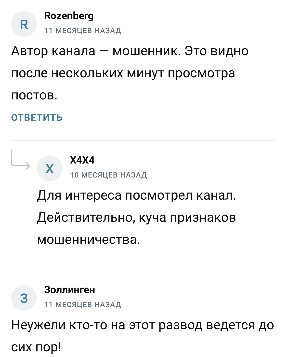 Таким образом, факторы, указанные выше, создают негативный образ трейдера Natalyavetu. Для наглядности информации мы составили список факторов, демонстрирующих мошеннический характер канала «Natalya финансовые новости»: