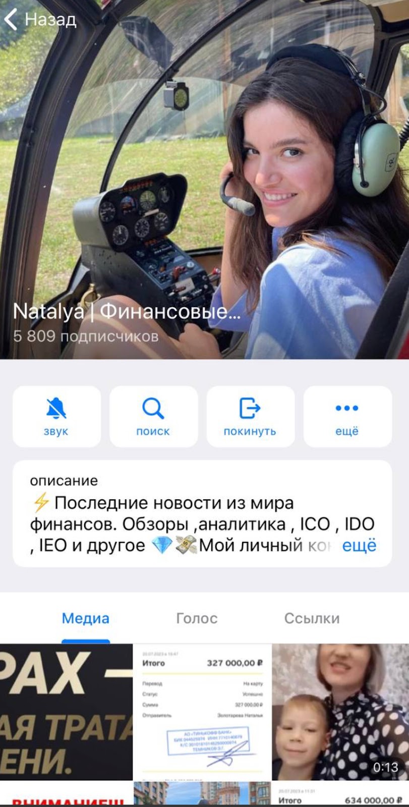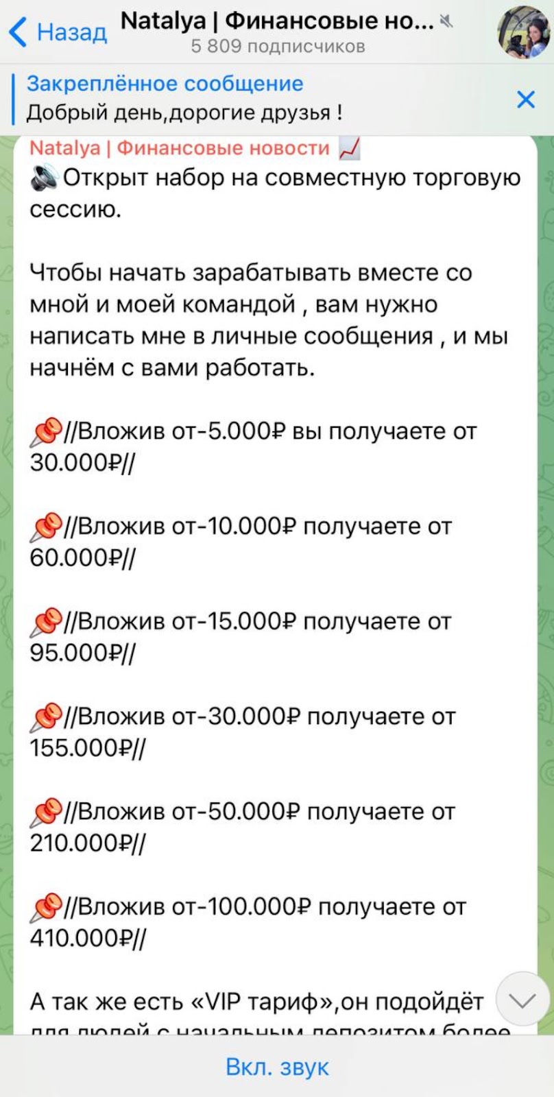 Админом канала «Natalya Финансовые новости» является Наталья Золотарева, чей профиль в тг можно было найти по имени Crypto Nat. Однако сейчас профиль инвестора, как и ее канал, был удален, скорее всего за нарушение правил сообщества Telegram. Сейчас, при попытке перейти по данному нику появляется неизвестный канал по трейдингу с 3 подписчиками.