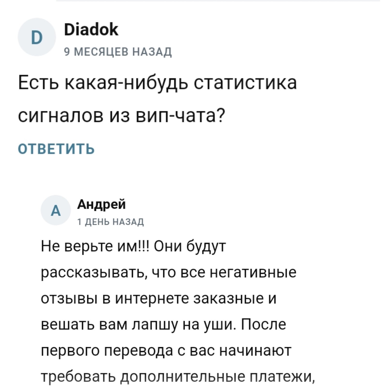 Профессионализм под вопросом. Паблик накручен, комментарии заблокированы. Сигналы убыточные, реклама приманка. Будьте осторожны! Отзывы, как один, о мошенничестве. Не кормите шарлатанов.