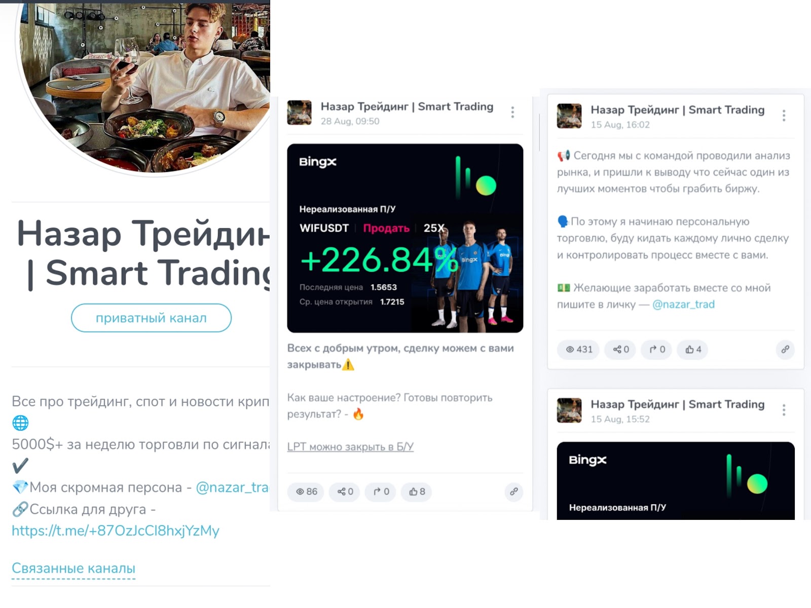 Назар трейдер ведет Telegram канал, который посвящен торговым сигналам. Автор предлагает персональную торговлю криптовалютами. При этом обещает значительный заработок. Мы рассмотрим блог детальнее и сообщим, стоит ли сотрудничать с Назаром.