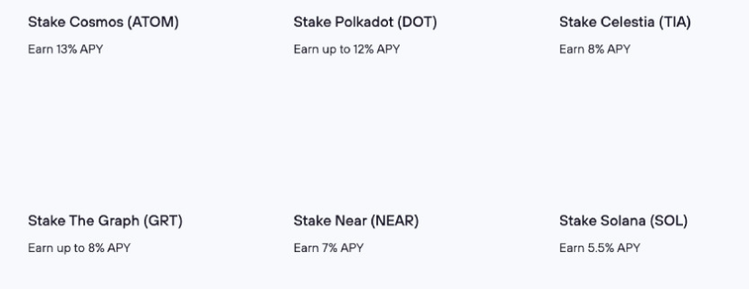 На сервисе реализована возможность стейкинга криптоактивов. APY в среднем составляет от 3,5 до 12%. При этом вариантов для стейкинга не так много: