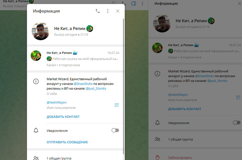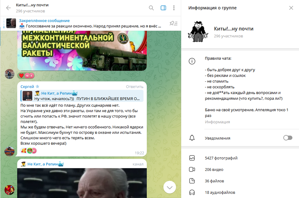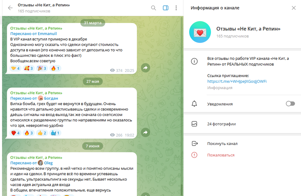 В Telegram есть группа, где Никита публикует отзывы участников платного сообщества «Не Кит, а Репин». Посты говорят о высокой окупаемости публикуемых сделок, отсутствии скальпинга, а также детальной росписи причин входа и закрытия. В отличие от чата «Киты, ну почти», здесь и не пахнет демократией. Никита ограничил комментарии, сам решает, какой репост публиковать.