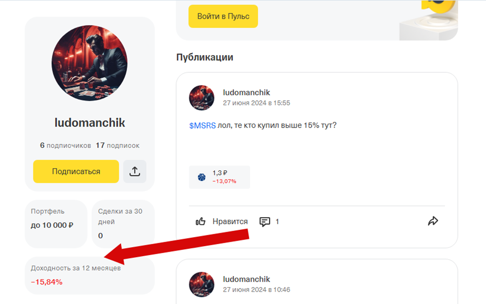 Красноречиво о работе трейдера говорит его профиль на «Пульсе» от Т-банка. Его инвестиционный портфель составляет менее 10000 рублей с убытком за последние 12 месяцев в 15,84%.