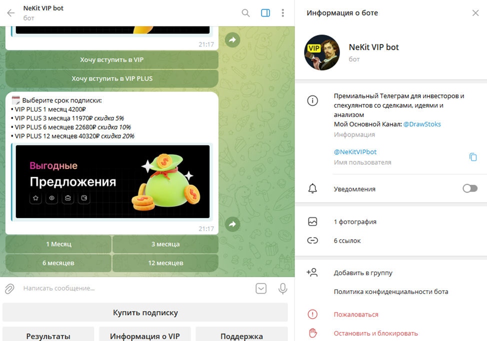 Купить подписку на VIP-группу, а также ознакомиться со статистикой ее работы, можно в боте NeKitVIPbot.
