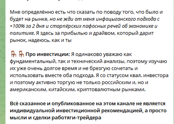 В своей работе NeKitRepin сочетает фундаментальный и технический анализ. Комбинированная стратегия позволяет ему не ограничиваться российским фондовым рынком, что существенно увеличивает шанс найти действительно выгодные финансовые инструменты для получения дохода. Однако в дисклеймере автор предупреждает, что он не дает инвестиционных рекомендаций, а просто публикует собственные мысли и ожидания.