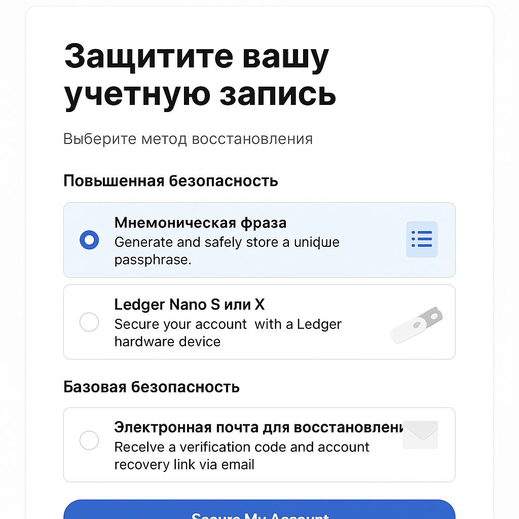 Кошелек создан разработчиками блокчейна «Ниар» Protocol — это система, которая известна низкими комиссиями и высокой скоростью транзакций. Сервис подойдет тем, кто хочет работать именно с токенами Near. Чтобы начать, нужно зайти на сайт и выбрать способ восстановления доступа. Система защиты предлагает записать секретную фразу из 12 слов или подключить кошелек Ledger — только после этого можно пополнять баланс.