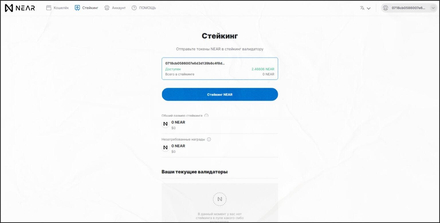 Доступны функции «Ниар Воллет Майн Хот» и стейкинг. С помощью сервиса можно зафиксировать токены в стейкинге на определенный срок и получать за это пассивный доход в виде 11% в год. Проценты в кошельке Near начисляются автоматически, но чтобы вывести средства из стейкинга, потребуется 2-3 дня. Это стоит учитывать, если вдруг цена Near начнет резко падать.