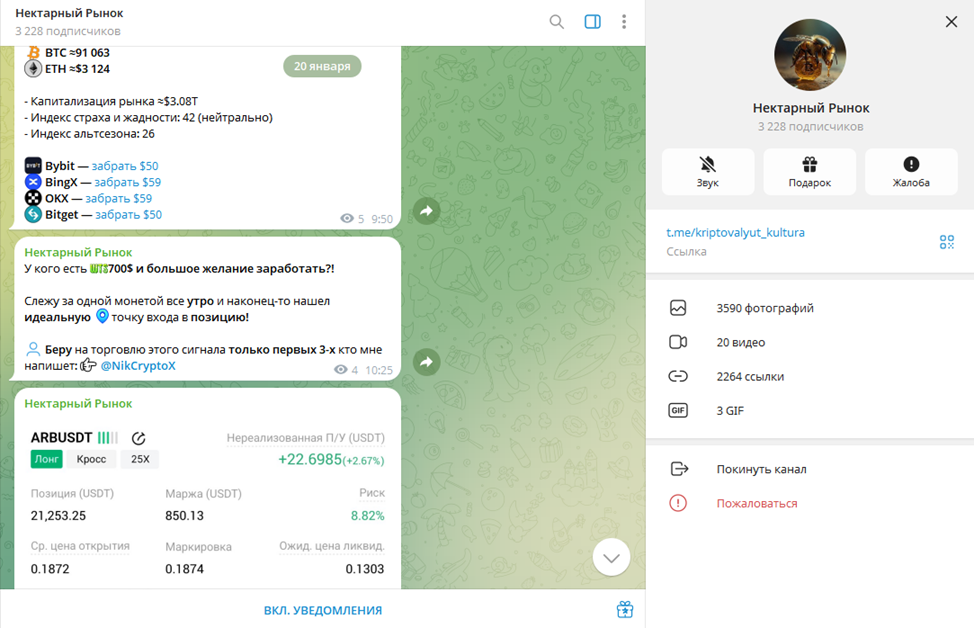 Канал «Нектарный Рынок» ворвался на просторы Телеграма 22 января 2026 года. Для старта проекта выбрана уже действующая группа с 3,2 тыс. подписчиков. Донор существует с 14 мая 2024 года и изначально предлагал обзоры токенов без сопутствующих платных услуг.