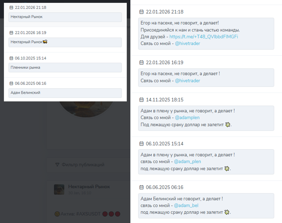 Анализ новостной ленты позволяет утверждать, что реально ТГ-канал @ Kriptovalyut Kultura контролирует не Пчелов, а @ NikCryptoX и @ Vsporte7. Эти аккаунты принадлежат мошенникам. Они управляют целой сеткой похожих ресурсов: