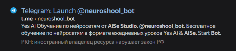 Использовать бота можно, никакой ответственности за это у целевой аудитории нет. Пометка носит информационный характер и предупреждает, что в будущем ресурс может быть заблокирован на территории РФ полностью или частично, если нарушения продолжатся. Другими словами, есть риск потратить деньги на подписку Neuroshool bot, но не успеть воспользоваться ей до конца из-за принудительного закрытия проекта.