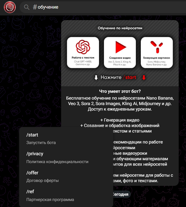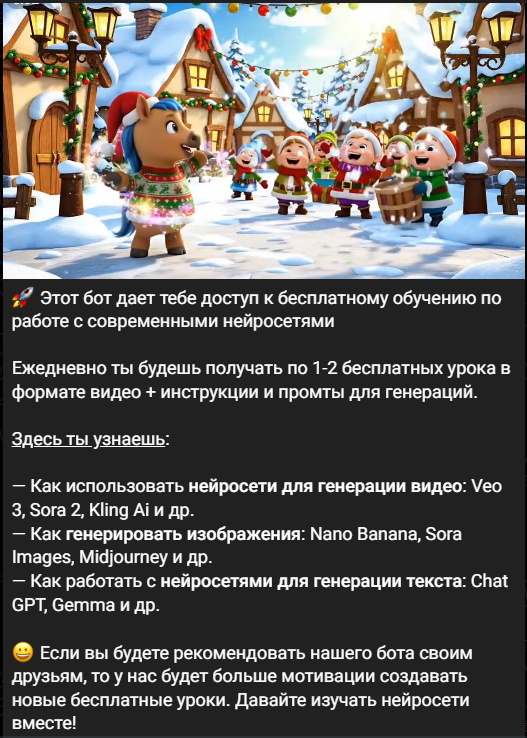 Neuroshool bot предлагает бесплатные видеоуроки уроки каждый день, практические рекомендации по работе с нейросетями, обучающие материалы и базу готовых промптов для всех ИИ.