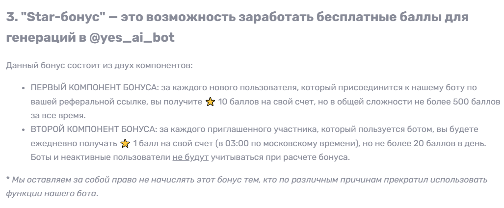 Neuroshool bot предполагает два вида бонусов. Основной – от прямых продаж и от продаж, сделанных приглашенными партнерами. Другими словами, в данном случае речь идет о многоуровневой системе. Дополнительно можно зарабатывать звездочки/баллы за активность – публикации, контент – и тратить их на генерации.