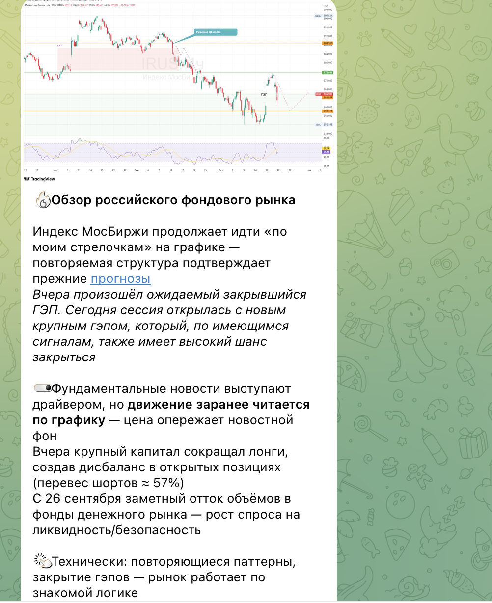 Ютуб канал оформлен как публичный источник видео с записями торговых сессий, интервью и рекламных материалов. В описаниях часто присутствуют ссылки на тг и платные сервисы. Контент ориентирован на практикующих трейдеров: акцент на идеях, краткосрочных и среднесрочных сделках, разборе настроения рынка и торговых идей, а не на академическом введении. Но значительная часть работоспособных торговых идей переводится в формат платных сигналов/ботов.