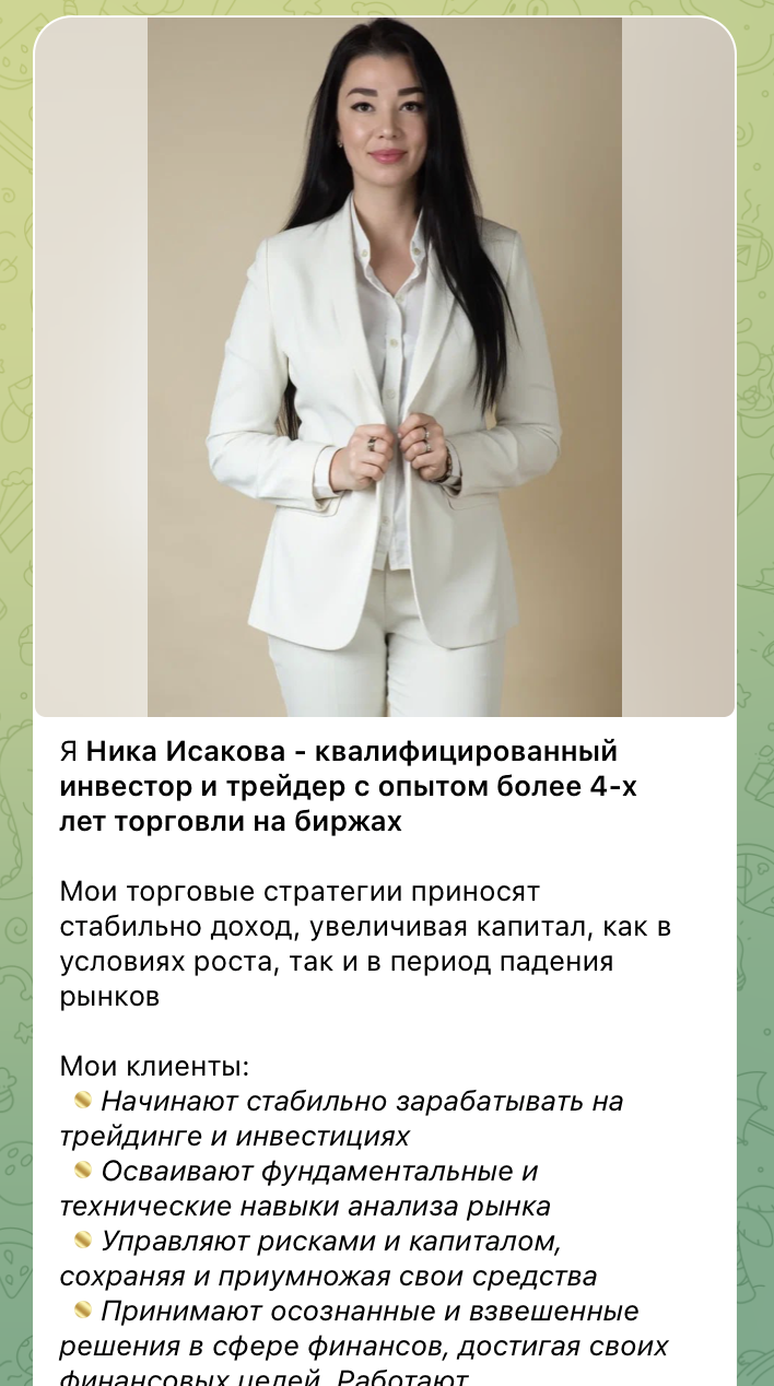 Телеграмм Ника Исакова Трейдинг как платформа используется для распространения сигналов, коротких разборов и закрытых рассылок. Сам факт наличия публичного канала и использование ботов — стандартная практика, но она также требует внимания к репутации и прозрачности.