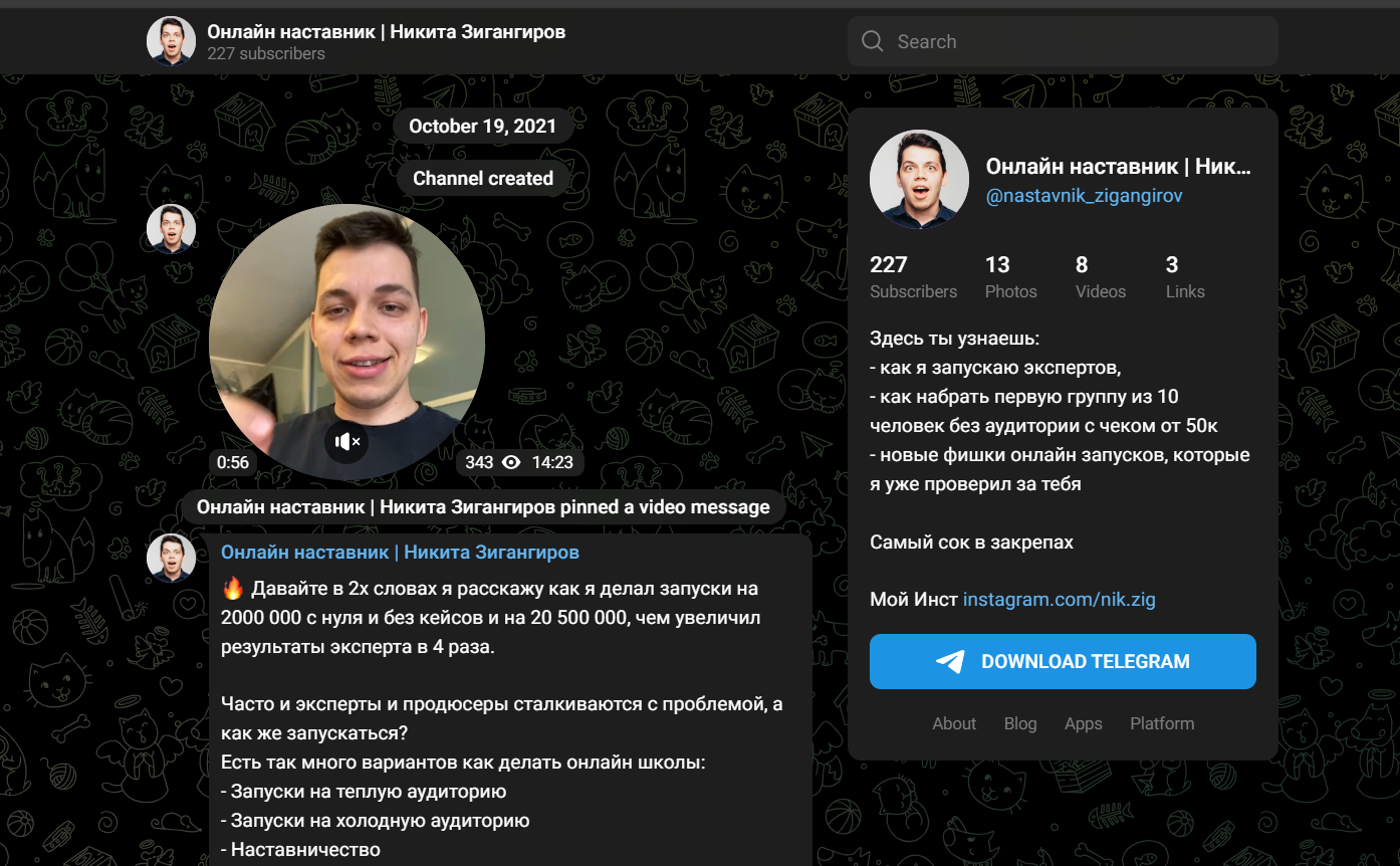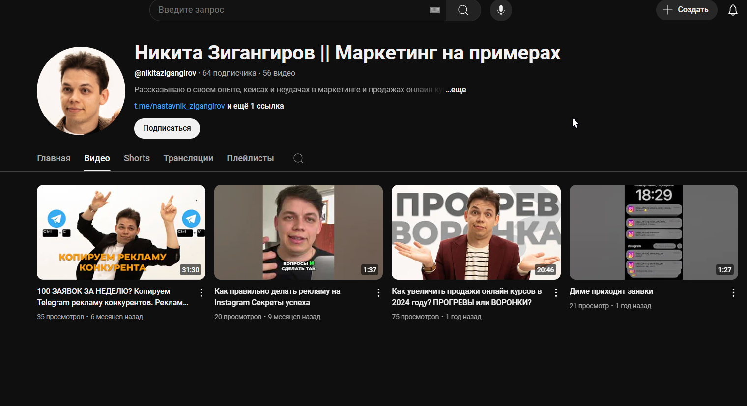 На телеграмм-канал подписано 277 человек. Здесь автор рассказывает, как запускать экспертов, набрать первую группу из 10 человек без аудитории с чеком на 50 0000 рублей. Охваты просмотров постов значительно выше данных из открытой статистики. Информации о платных услугах нет. Сам канал был создан 19 октября 2021 года.Курс Никиты Зигангирова «Маркетинг на примерах»