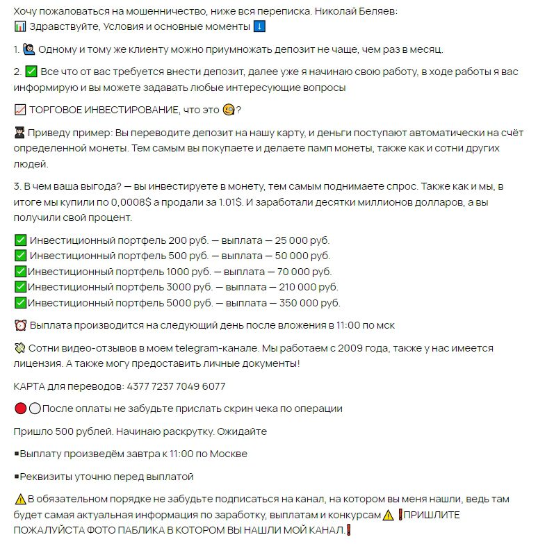 Телеграм-канала Николая Беляева – очередной лохотрон для развода наивных инвесторов. На это указывают следующие признаки мошенничества: